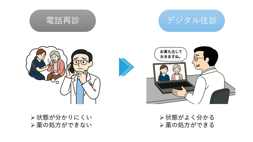 訪問看護師が発見した患者さんの体調変化や軽い外傷などのマイナートラブルに対しては、往診に加えて電話再診が一般的に行われていますが、音声のみによるコミュニケーションでは状態把握が十分でなく、また薬剤処方もできないという問題があります。オンライン診療を活用すると、ビデオ映像を通じて状態をよく観察することができ、薬剤処方することもできます。
