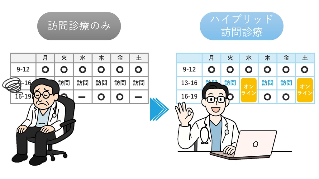 対面とオンライン診療によるハイブリッド訪問診療を適切に組み合わせると、同じ訪問件数でより多くの患者さんの診療を効率的に行うことができます。